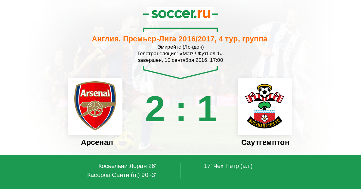Рады приветствовать поклонников игры номер 1 в мире на матче 4-го тура Премьер-лиги Англии, в котором лондонский "Арсенал" примет "Саутгемптон" на "Эмирейтс Стэдиум". Крайний матч между этими соперниками завершился интереснейшей ничьей 0:0. Да, клубы не забили тогда голов, но нанесли по воротам друг друга в сумме 34 удара за игру! Будут ли они в этот раз точными? Сайт http://www.soccer.ru проведёт прямую текстовую онлайн трансляцию матча, комментировать игру для вас будет Старчеус Сергей.