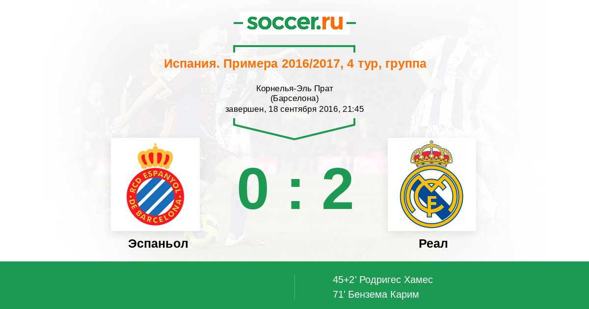 Подопечные Зинедина Зидана благодаря голам Хамеса Родригеса и Карима Бензема одерживают уверенную победу над "Эспаньолом"! Были шансы у "попугаев" спасти эту игру до того как "Реал" забил второй мяч, но так и не получилось у них распечатать ворота именитого соперника. Предлагаем выбрать лучших игроков в составах команд, комментировал для вас Дмитрий Отмахов. До новых встреч на soccer.ru.