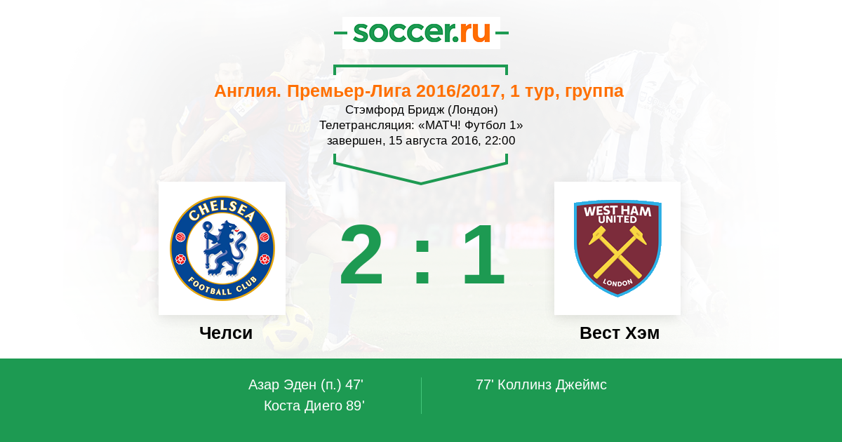 Доброго вечер, уважаемые любители футбола! Сегодня лондонским дерби, в котором сойдутся "Челси" и "Вест Хэм", завершится первый тур английской Премьер Лиги. Встреча двух именитых соперников на "Стэмфорд Бридж" обещает поклонникам футбола интересную игру. В прошлом сезоне "аристократам" так и не удалось обыграть неуступчивую команду Славена Билича. Домашний поединок "молотобойцы" выиграли со счетом 2:1, а игра на "Стэмфорд Бридж" завершилась ничьей со счетом 2:2. За период летнего трансферного окна обе команды не только смогли сохранить своих лидеров, но и неплохо усилиться. Конечно же, фаворитом сегодняшнего противостояния считаются хозяева поля, но футбол штука не предсказуемая, да и "Вест Хэм" команда с характером. С нетерпением ждем стартового свистка Энтони Тэйлора . Вместе с Вами следить за событиями этого непредсказуемого матча на soccer.ru будет Дмитрий Отмахов.