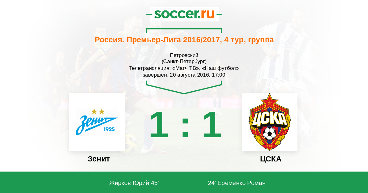 Здравствуйте, уважаемые любители отечественного футбола! Сегодня в 17.00 по московскому времени в северной столице на стадионе "Петровском" состоится главный матч тура: "Зенит" принимает "ЦСКА". Наиболее маститые и титулованные клубы в современной истории российского футбола в рамках 4-го тура РФПЛ померятся силами между собой. "Зенит" за время прибытия у руля "армейской" команды Леонида Слуцкого успел поменять уже достаточное количество наставников, и теперь экс-тренеру сборной России будет противостоять румынский специалист Мирча Луческу. http://www.soccer.ru непременно будет следить за основными событиями этого матча, а текстовую онлайн-трансляцию для вас буду вести я, Роман Земко. Ждем увлекательного футбола!