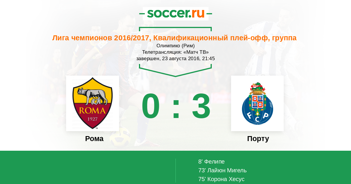 Доброго времени суток, уважаемые любители футбола! Командам, участвующим в квалификации к Лиге Чемпионов, осталось сделать последний, решающий шаг, чтобы попасть в групповую стадию основного турнира. "Драконы" из Португалии приедут в гости на недружелюбный "Олимпико" в Рим, где местные "волки" будут отстаивать результативную ничью в первом матче (1-1). Встреча на "Драгау" показала, что явного фаворита в этой паре нету, обе команды создали множество острых моментов, но реализовали лишь по одному. Будьте уверены, что сегодня нас ждет очень "жаркий" матч! http://www.soccer.ru будет вести онлайн-трансляцию этой встречи, комментировать которую буду я, Роман Земко. Стартовый свисток польского арбитра Шимона Марциняка прозвучит в 21.45 по московскому времени. Не пропустите!