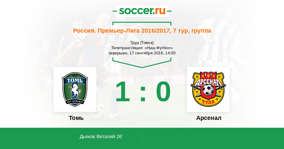 Приветствуем всех любителей отечественного футбола на "Соккер.ру"! Насыщенная субботняя игровая программа 7-го тура Российской Премьер-Лиги начинается с матча в Томске, где местная команда примет гостей из Тулы. "Томь" против "Арсенала" - вывеска не самая яркая, однако, можно не сомневаться, что нас ждет футбол, полный самоотдачи и бескомпромиссной борьбы на поле. Битва "андердогов" иногда бывает жарче по накалу и страстям, чем топовый матч команд из верхушки таблицы. Обоим коллективам необходимы очки для того, чтобы по возможности закрепиться по выше. Плотность в турнирной таблице достаточно высокая, чемпионат только набирает обороты. Главным арбитром этого матча назначен Игорь Федотов из Москвы, стартовый свисток прозвучит в 14.00 по московскому времени. Текстовую онлайн-трансляцию для вас проведет Роман Земко.