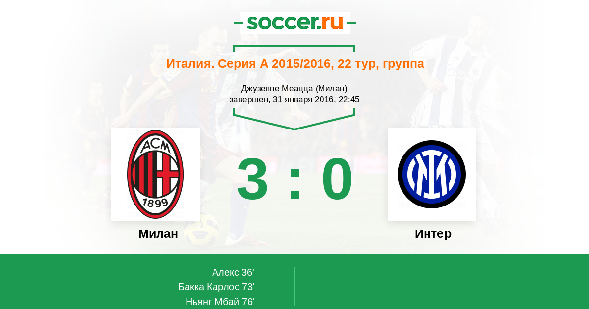 Завершился матч в миланском дерби победой номинальных хозяев поля со счётом 3:0! Как по мне, так "Интер" не заслуживал такого крупного поражения, но что-то пошло не так и в их ворота влетело три мяча. Приглашаем проставить оценки футболистам матча http://www.soccer.ru/matches/ratings/988051.shtml. Не простые времена переживают два легендарных клуба Италии, болельщикам желаю терпения. Матч провёл Старчеус Сергей, до новых встреч на http://www.soccer.ru, любите спорт и играйте в футбол!