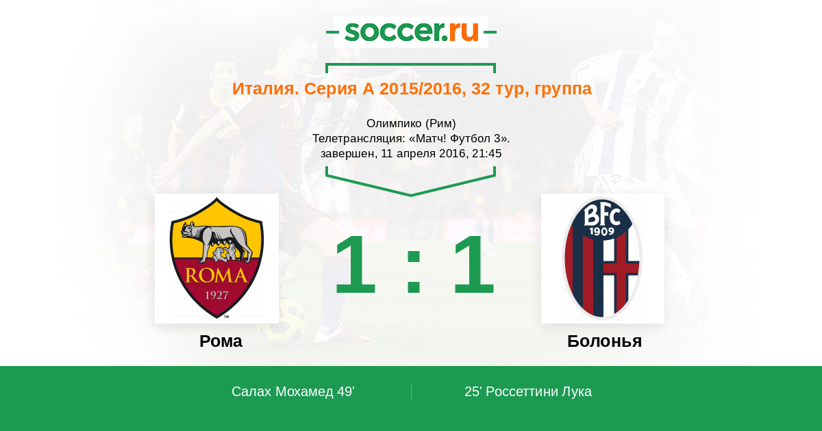 Отличный матч выдали команды на "Олимпико" в Риме, где "Рома" сыграла с "Болоньей" в ничью 1:1. Хозяева весь матч атаковали, много владели мячом и преимуществом на поле, но реализовать свои голевые моменты не смогли. Гости воспользовались своим шансом забить, затем успешно удержали счёт матча. Приглашаем проставить оценки футболистам матча http://www.soccer.ru/matches/ratings/988148.shtml. Прямую текстовую онлайн трансляцию матча для Вас провёл Старчеус Сергей. Оставайтесь с http://www.soccer.ru !
