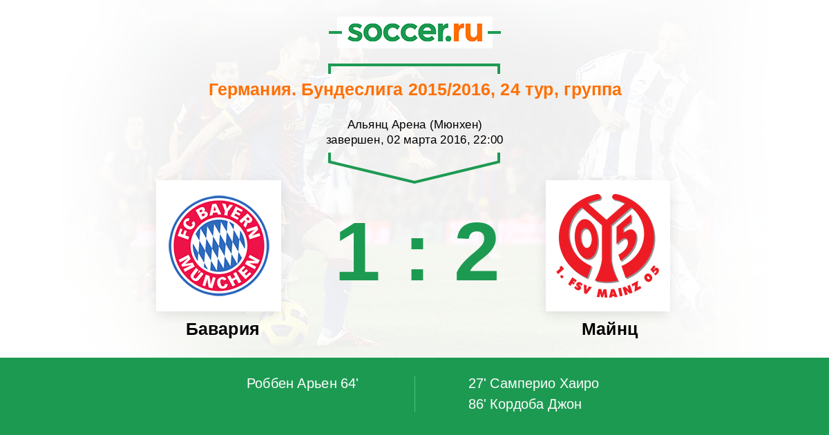 Доброго времени суток, уважаемые любители футбола. Сайт soccer.ru предлагает вашему вниманию онлайн-трансляцию матча чемпионата Германии Бавария - Майнц. Вместе с вами за ходом данного поединка будет следить Акопов Максим. Стартовый свисток прозвучит в 22:00 по московскому времени.