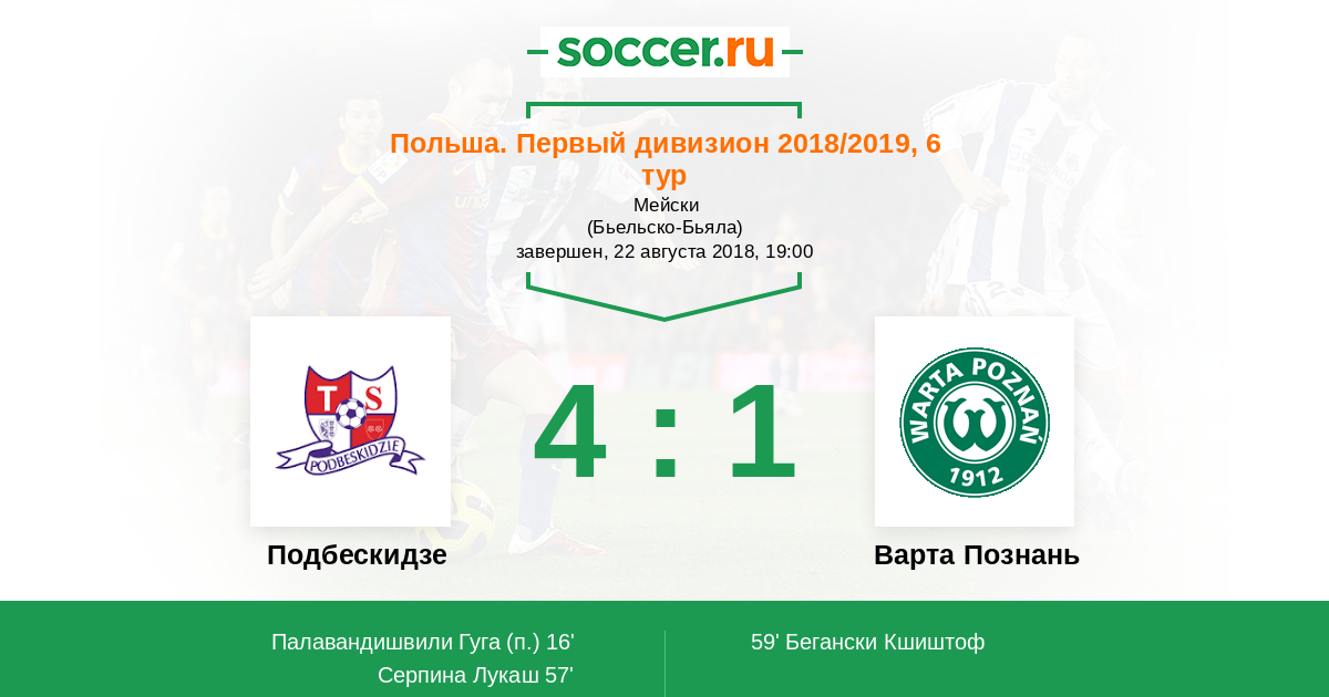 Подбескидзе - Варта Познань: обзор матча 22 августа 2018