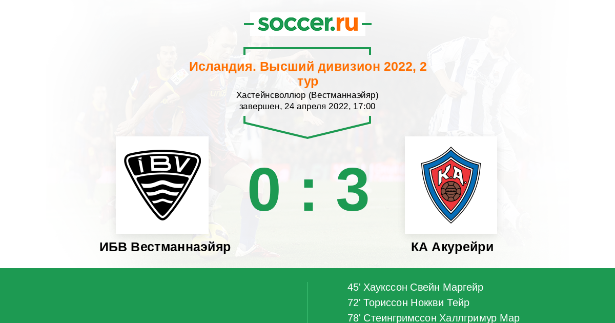 ИБВ Вестманнаэйяр | 22 | 4 | 8 | 10 | 2 | 33:44 | 20 |