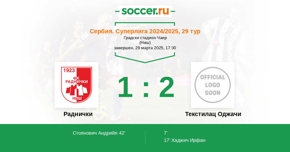 Текстилац Оджачи | 37 | 11 | 4 | 22 | 6 | 33:65 | 37 |