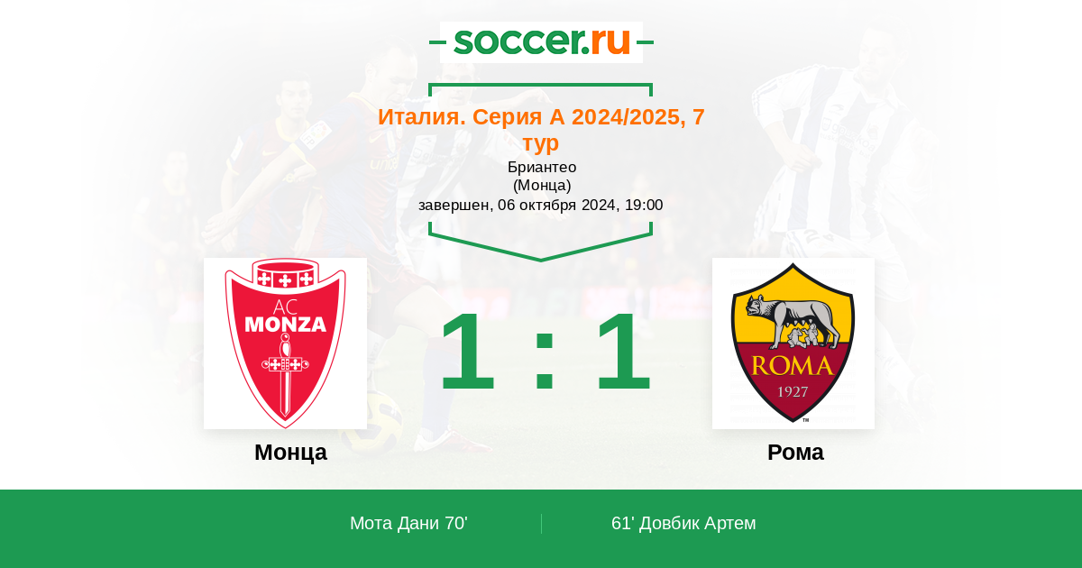 Монца прямо сейчас занимает последнюю позицию в турнирной таблице Серии А и ей очень нужно набирать очки. В матче с Ромой, весьма нестабильно играющей в этом сезоне, всё возможно. Команды сыграют вничью. Счёт 1:1