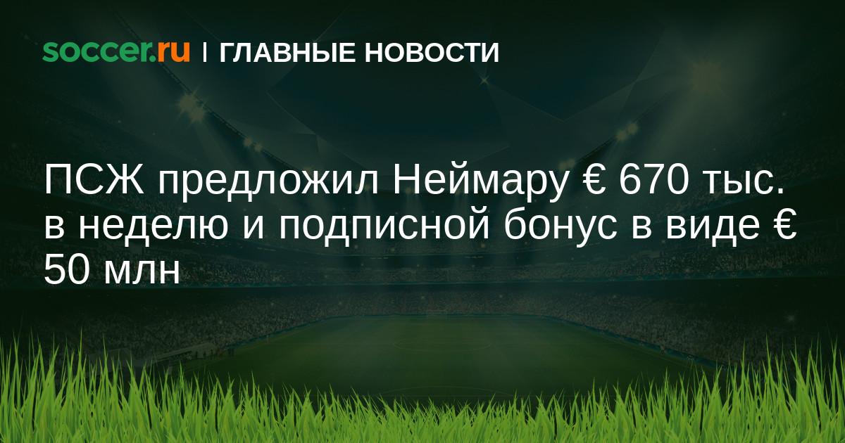 В случае перехода из «Барселоны» в ПСЖ бразильский нападающий Неймар сможет получать € 673 тыс. в неделю, утверждает источник. Также сообщается, что 25-летний форвард получит € 50 млн сразу после подписания контракта с парижанами.