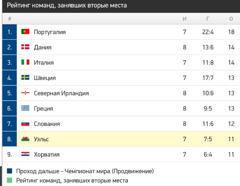 Интересно кто окажется "лишний" из 9-ти вторых мест.....Греки точно выиграют у Гибралтара....а вот у Уэльса побед меньше чем у Хорватии......и играть им с Ирландией....