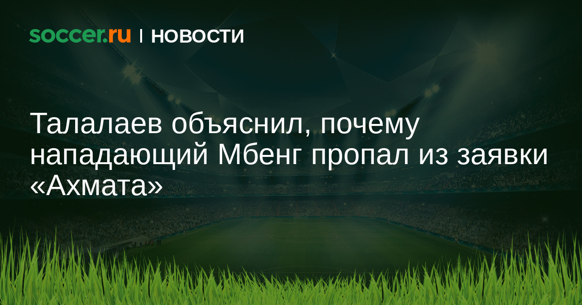 Главный тренер «Ахмата» Андрей Талалаев рассказал, по какой причине нападающий Аблайе Мбенг пропал из заявки грозненской команды. В последний раз Мбенг выходил на поле за «Ахмат» 15 июля 2020 года в матче 29-го тура РПЛ против «Спартака».