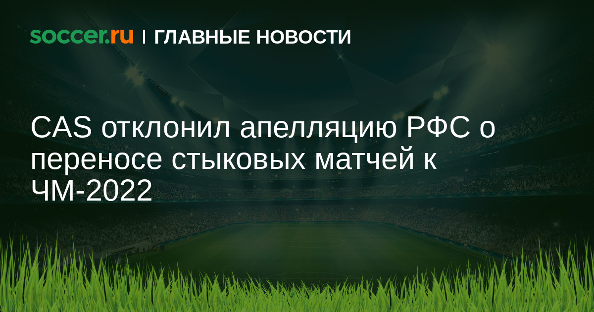 Спортивный арбитражный суд (CAS) отклонил апелляцию Российского Футбольного Союза (РФС) касательно переноса стыковых матчей в рамках отбора на чемпионат мира-2022. Об этом сообщила пресс-служба суда.