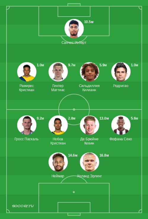 Отметим попадание в топ трех игроков из РПЛ — защитников Кристиана Рамиреса и Родригао, а также хавбека Кристиана Нобоа. Кроме того, в число лучших вошли представители АПЛ, Бундеслиги и французской Лиги 1. Ну а пару форвардов составили звездные Неймар и Эрлинг Холанд.