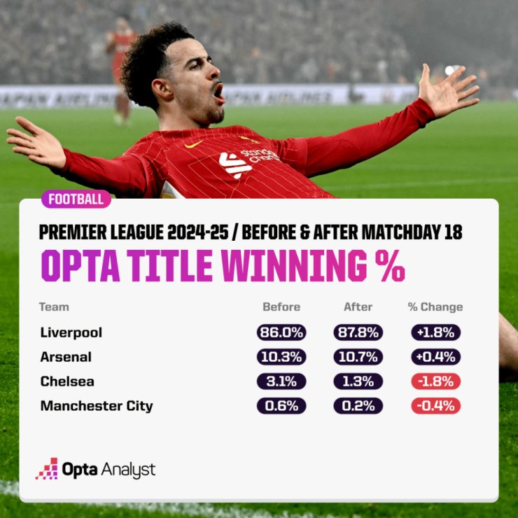 Суперкомпьютер Opta подсчитал, что «красные» станут чемпионами Англии с вероятностью 87,8%. Шансы «Арсенала» оценены в 10,7%, «Челси» – 1,3%, «Манчестер Сити» – 0,2%.