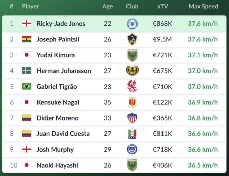 Возглавили список два игрока: Рики Джейд-Джонс из клуба английской Лиги Один «Петерборо» и Джозеф Пэйнтсил из американского «ЛА Гэлакси». Их показатель равняется 37.6 км/ч. Замкнул тройку японец Юдай Кимура из «Токио Верди» (37.1 км/ч).