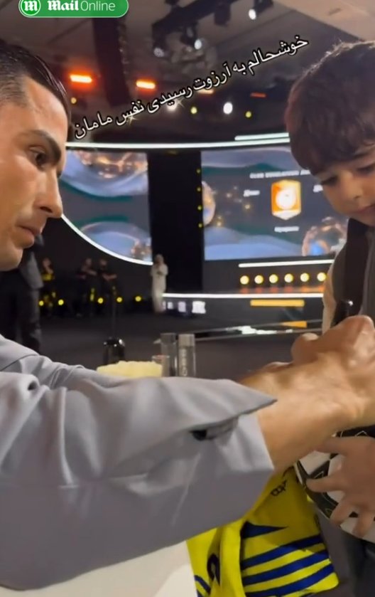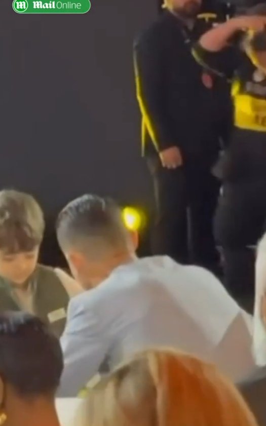 К сидевшему в кресле игроку подошёл мальчик с футболкой, мячом и ручкой. Ребёнка быстро заметил сотрудник службы безопасности, который бросился, чтобы попытаться остановить его от приближения к португальцу, однако тот отмахнулся от охранника и взял у мальчика ручку, прежде чем расписаться на мяче и футболке.