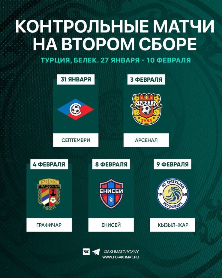«Ахмат» объявил своих соперников по второму учебно-тренировочному сбору, который пройдёт в Белеке с 27 января по 10 февраля. Грозненцы сыграют с «Септември», тульским «Арсеналом», «Графичаром», «Енисеем» и «Кызыл-Жаром».
