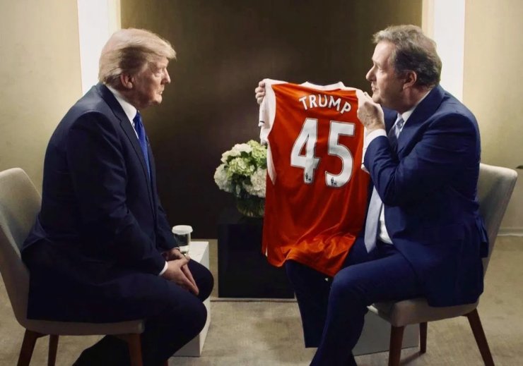 Британский телеведущий и болельщик «Арсенала» Пирс Морган опубликовал фото, на котором он вручает Дональду Трампу футболку «Арсенала» с именем президента США и номером 45.