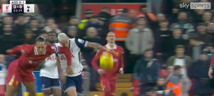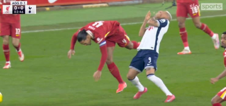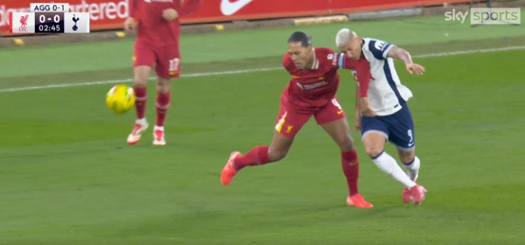Защитник «Ливерпуля» Вирджил ван Дейк жёстко сыграл против нападающего «Тоттенхэма» Ришарлисона в ответном матче Кубка Английской Лиги.