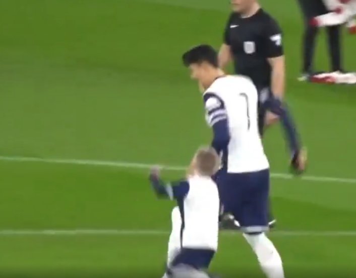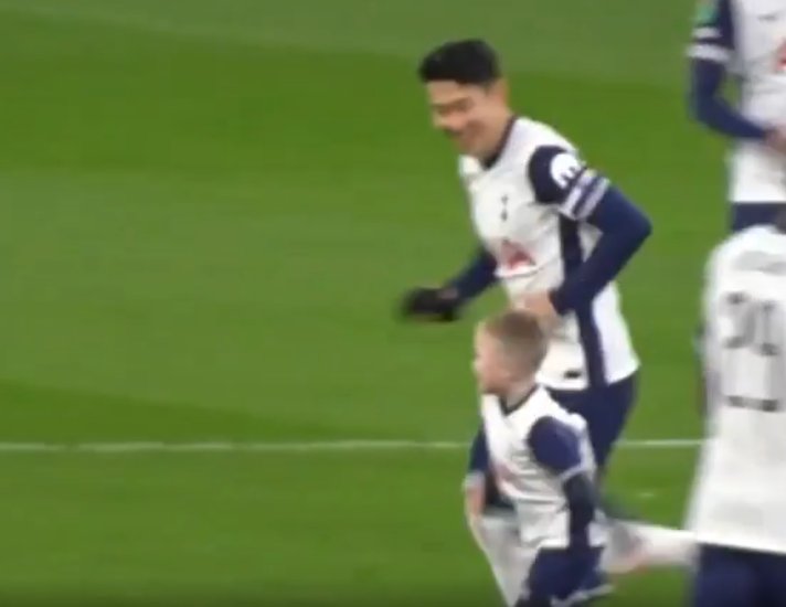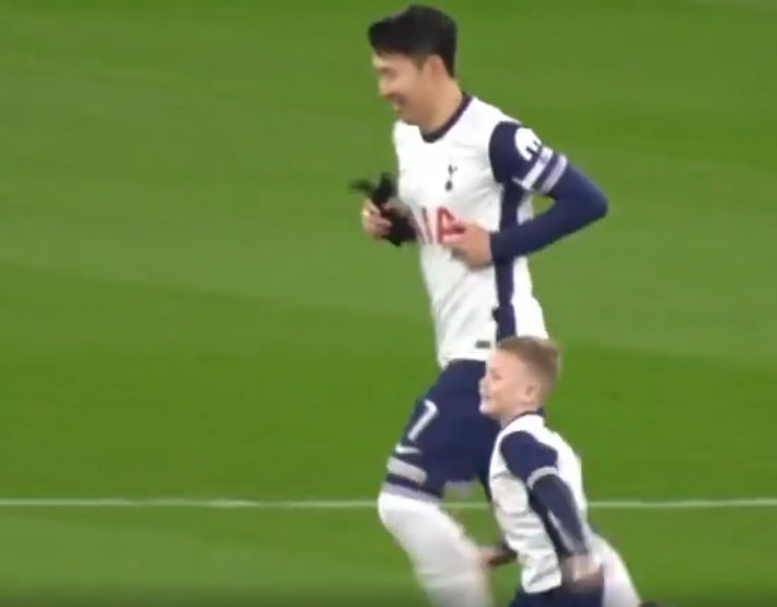 Один из мальчиков, выходивших на поле вместе с футболистами, присоединился к нападающему «шпор» Хын-Мин Сону на разминке и решил повторить за игроком его действия.