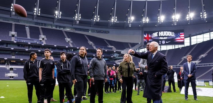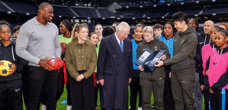 Находясь на поле стадиона, Карл III наблюдал за сеансом проекта The Huddle Project — уникального сотрудничества между Tottenham Hotspur Foundation, NFL Foundation и Nike, в рамках которого футбол и флаг-футбол, наряду с оздоровительными мероприятиями, проводятся для подростков 11-18 лет в районе где расположен клуб. После встречи с участниками проекта Его Величеству были вручены памятные подарки от клуба и NFL — копия исторической статуи золотого петушка и мяч с игр NFL в Лондоне.