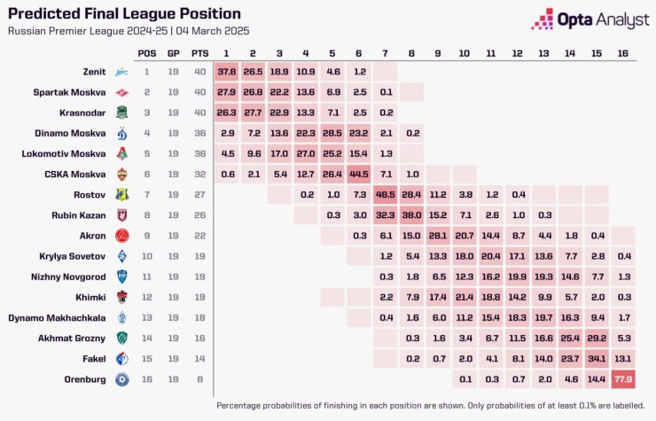 Суперкомпьютер Opta подсчитал, что по итогам 19 туров вероятность того, что «Спартак» займёт первое место, составляет 27,9%.