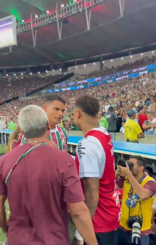 Нападающий «Сантоса» Неймар и защитник «Флуминенсе» Тиаго Силва встретились у кромки поля перед очным матчем команд в бразильской Серии А.