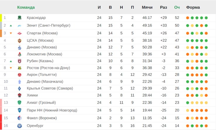 В РПЛ «Краснодар» сохраняет лидерство (52 очка), но после поражения от «Зенита» отрыв от второго места сократился. У клуба из Санкт-Петербурга 50 баллов. Далее идут «Спартак» и ЦСКА, у них по 47 пунктов. В зоне стыковых матчей находятся «Ахмат» (23 очка) и «Пари НН» (20 баллов). Замыкают таблицу «Факел» и «Оренбург» (15 и 14 баллов соответственно).