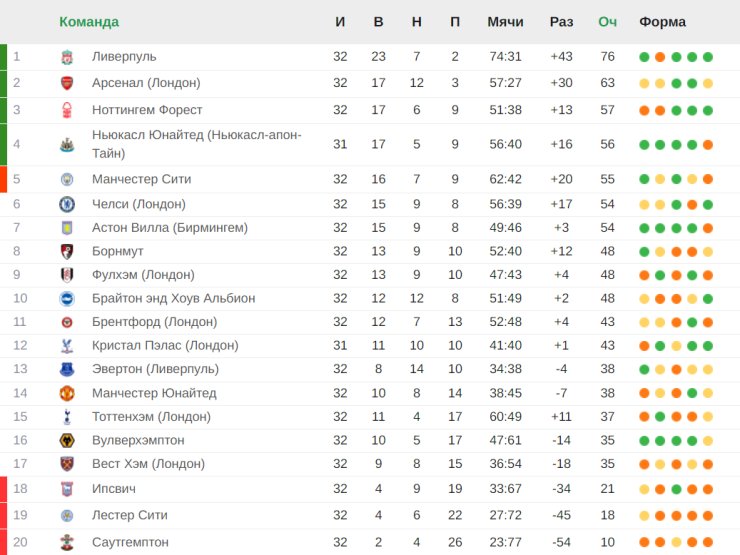 В АПЛ в отрыв ушёл «Ливерпуль» (76 очков). Следом идёт «Арсенал» (63 балла). Третий — «Ноттингем Форест» (57 пунктов), а замыкает первую четвёрку «Ньюкасл» (56 очков). В зоне вылета располагаются «Ипсвич», «Лестер» и «Саутгемптон» (21, 18 и 10 баллов соответственно).