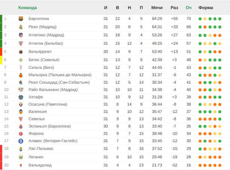 В Ла Лиге таблицу возглавляет «Барселона» (70 очков). Вторым идёт «Реал» (66 баллов), третьим — «Атлетико» (63 пункта). Топ-4 замыкает «Атлетик» (57 очков). В зоне вылета находятся «Лас-Пальмас», «Леганес» и «Вальядолид» (29, 28 и 16 баллов соответственно).