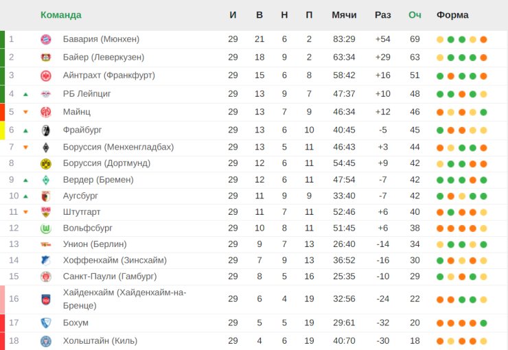 В Бундеслиге на первом месте находится «Бавария» (69 очков). Далее идут «Байер» (63 балла) и «Айнтрахт» (51 пункт). На четвёртой позиции располагается «РБ Лейпциг» (48 очков). В зоне переходных игр находится «Хайденхайм» (22 балла). Замыкают таблицу «Бохум» и «Хольштайн» (20 и 18 пунктов соответственно).