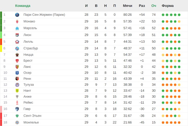 Во французской Лиге 1 первый ПСЖ (74 очка). «Монако» — второй (53 балла), «Марсель» идёт следом (52 пункта). Также в топ-4 — «Лион» (51 очко). В зоне стыковых матчей идёт «Гавр» (27 баллов). Замыкают таблицу «Сент-Этьен» и «Монпелье» (24 и 15 пунктов соответственно).