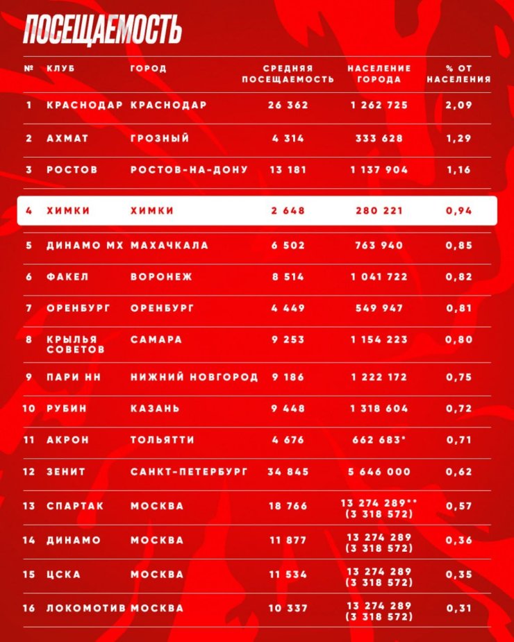 По итогам анализа «Химки» заняли четвертую позицию в рейтинге с посещаемостью матчей в 0,94% от числа жителей города.