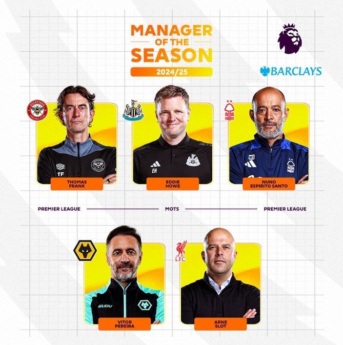 На награду претендуют: Томас Франк («Бренфторд»), Арне Слот («Ливерпуль»), Нуну Эшпириту Санту («Ноттингем»), Витор Перейра («Вулверхэмптон») и Эдди Хау («Ньюкасл»).