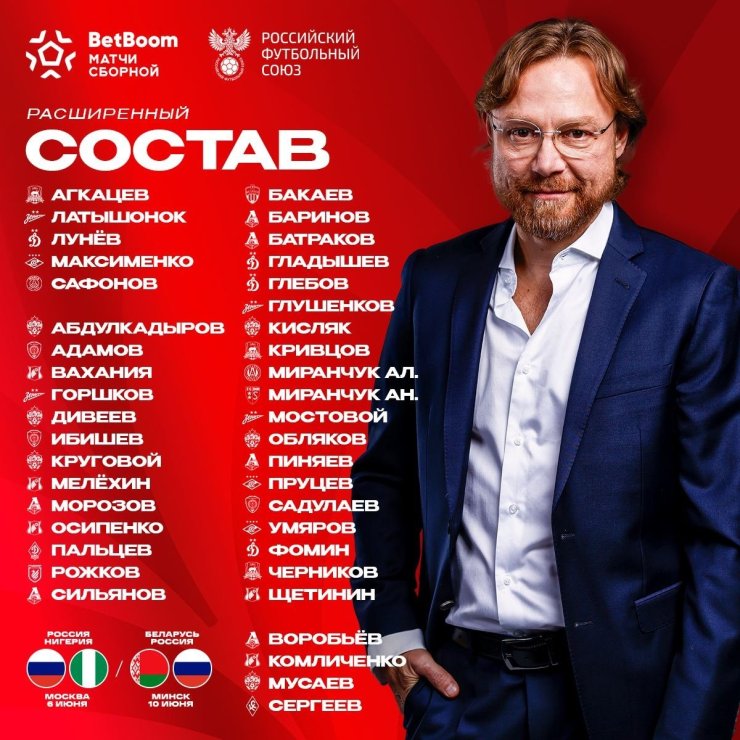 В расширенный список попал 41 футболист, в том числе легионеры — Матвей Сафонов, Алексей Миранчук и Антон Миранчук.