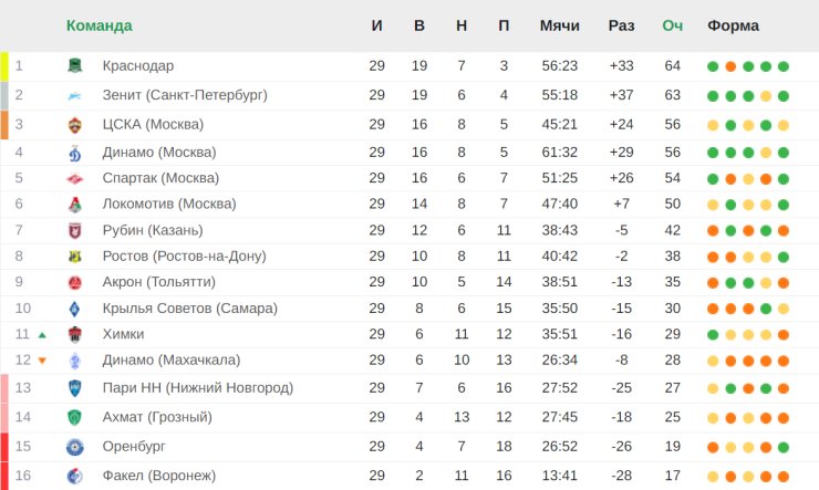 В РПЛ лидирует «Краснодар» (64 очка). На втором месте находится «Зенит» (63 балла), далее следуют ЦСКА и московское «Динамо» (по 56 пунктов). В зоне стыковых матчей располагаются «Пари НН» (27 очков) и «Ахмат» (25 баллов). Замыкают таблицу «Оренбург» и «Факел» (19 и 17 пунктов соответственно).