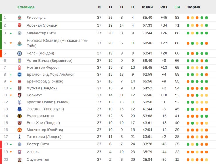В АПЛ ставший чемпионом «Ливерпуль» имеет в активе 83 очка. Следом идёт «Арсенал» (71 балл), на третьем месте находится «Манчестер Сити» (68 пунктов). Первую четвёрку замыкает «Ньюкасл» (66 очков). В зоне вылета — «Лестер Сити», «Ипсвич» и «Саутгемптон» (25, 22 и 12 баллов соответственно).