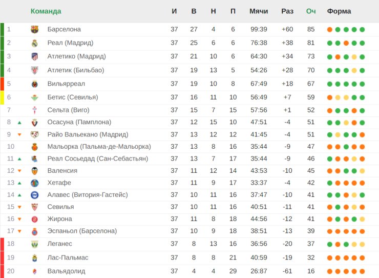 В Ла Лиге на счету победителя чемпионата Испании «Барселоны» 85 очков. «Реал» — второй (81 балл), «Атлетико» идёт третьим (73 пункта). Также в топ-4 располагается «Атлетик» (70 очков). Таблицу замыкают «Леганес», «Лас-Пальмас» и «Вальядолид» (37, 32 и 16 баллов соответственно).