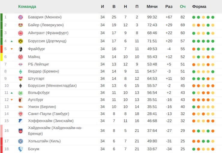 В Бундеслиге завершился сезон. Выиграла турнир «Бавария», набрав в итоге 82 очка. Вторым стал «Байер» (69 баллов), третьим — «Айнтрахт» (60 пунктов). На четвёртой позиции оказалась дортмундская «Боруссия» (57 очков). 16-е место занял «Хайденхайм», набравший 29 баллов. Клуб сыграет в стыковых матчах за право выступить в элитном дивизионе в следующем сезоне с «Эльфсбергом», занявшим третью позицию в Бундеслиге 2. Покинули высшую лигу «Хольштайн» и «Бохум» (по 25 пунктов).