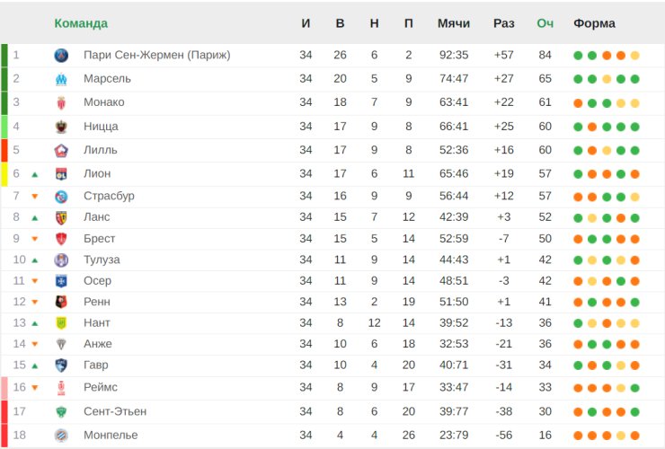 Также сезон завершился во французской Лиге 1. Выигравший чемпионат ПСЖ набрал 84 очка. Второе место занял «Марсель» (65 баллов), третье — «Монако» (61 пункт). Замкнула топ-4 «Ницца» (60 очков). В переходных играх «Реймс» (16-е место, 33 балла) сыграет с «Мецем». В Лигу 2 вылетели «Сент-Этьен» (30 очков) и «Монпелье» (16 баллов).