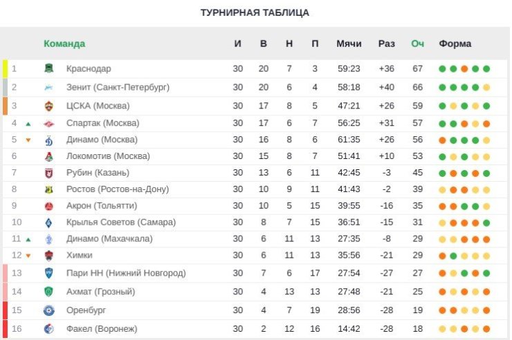 Чемпионом впервые в своей истории стал «Краснодар». 2-е место занял «Зенит», а тройку лучших замкнул ЦСКА. В стыковых матчах за право остаться в РПЛ сыграют «Пари НН» и «Ахмат», а вылетели из высшей лиги «Оренбург» и «Факел».