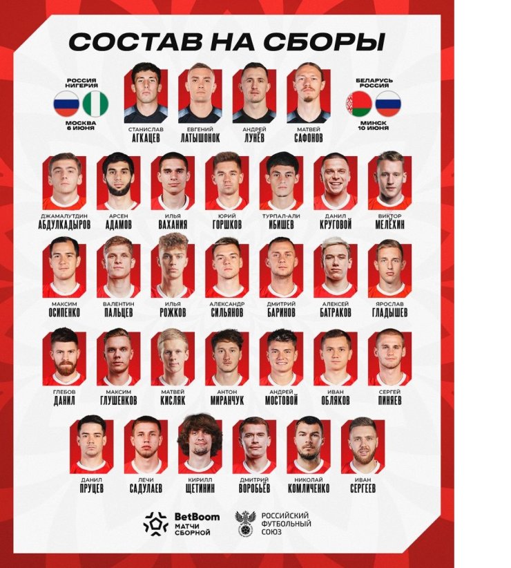 Опубликован окончательный список игроков сборной России на матчи с Нигерией (6 июня) и Беларусью (10 июня).