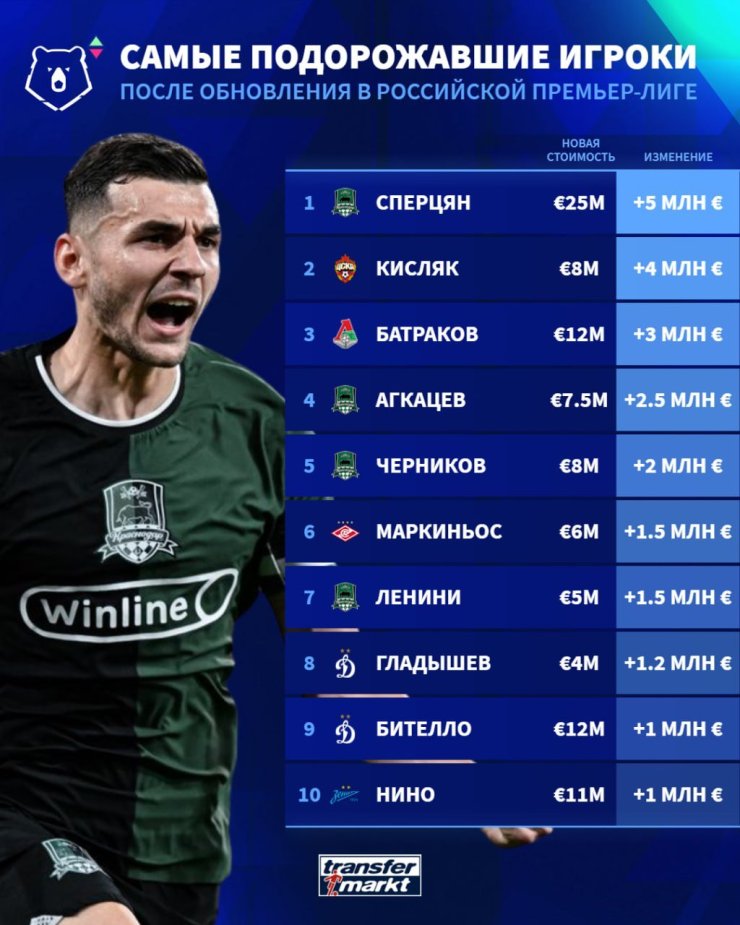 Портал Transfermarkt опубликовал списки самых подорожавших и подешевевших игроков РПЛ по итогам обновлений. Больше всего прибавил в цене полузащитник «Краснодара» Эдуард Сперцян — 5 миллионов евро. Теперь его трансферная стоимость составляет 25 миллионов евро. Также отметим, что в топ-10 самых подорожавших игроков РПЛ четыре представителя новоиспечённого чемпиона.