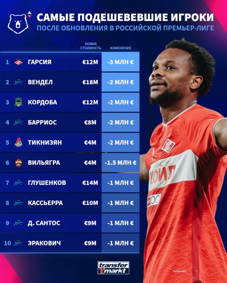 Больше всего потерял в цене нападающий «Спартака» Ливай Гарсия — 3 миллиона евро. Стоит отметить, что в топ-10 самых подешевевших игроков РПЛ шесть футболистов «Зенита».