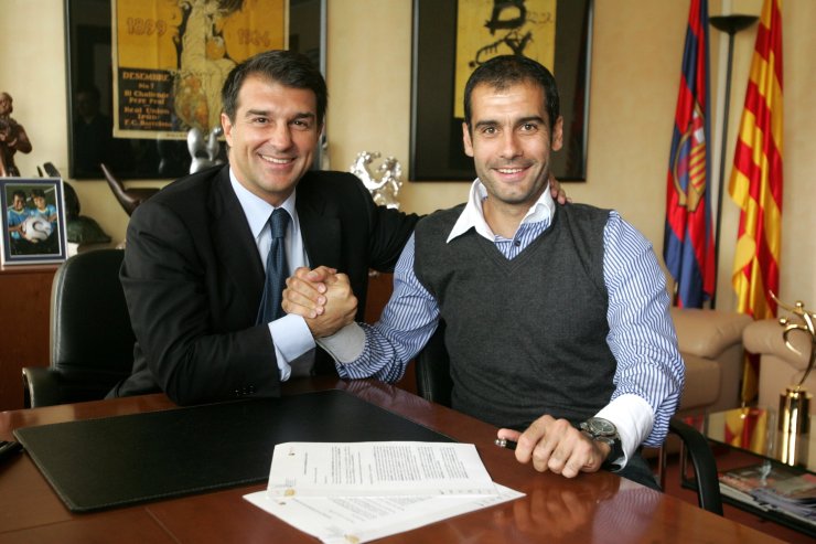 Пресс-служба каталонского клуба в честь этой даты опубликовала фото с момента подписания первого контракта Гвардиолы вместе с Жоаном Лапортой.