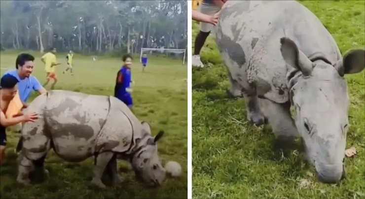 Игра, проходившая в Саурахе, была приостановлена, когда на поле вышел носорог, чтобы поесть травы. Игроки аккуратно вывели животное за пределы поля.