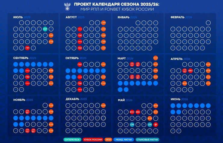 Новый сезон РПЛ стартует 20 июля 2025 года, а завершится 17 мая 2026 года. Матчи стартового тура группового этапа Пути РПЛ Кубка России пройдут с 29 по 31 июля. Первый раунд Пути регионов состоится 5-7 августа.