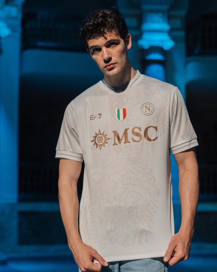 Выездная футболка включает девять элементов неаполитанской культуры, символизирующих особенности города.