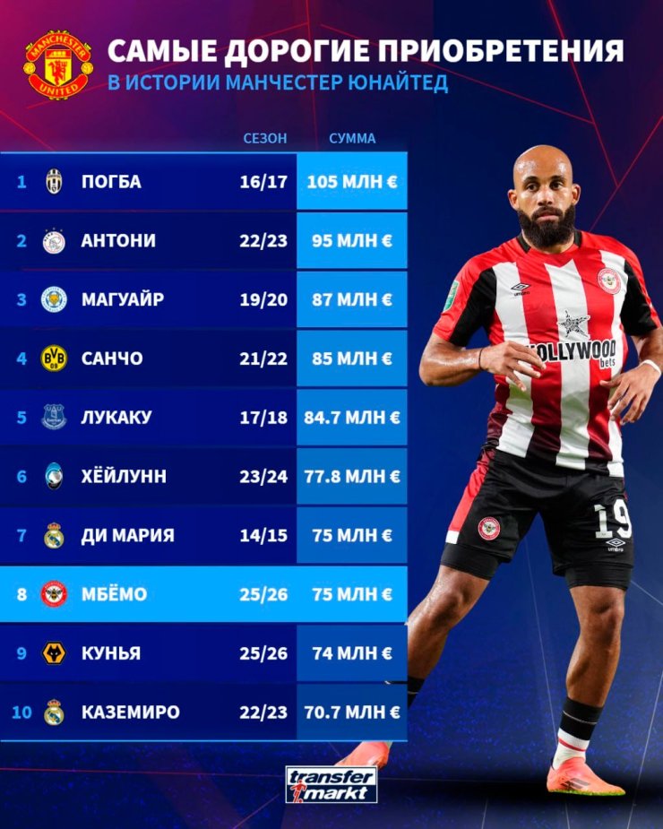 В топ-3 оказались покупки Поля Погба за 105 млн евро, Антони за 95 млн евро и Харри Магуайра за 87 млн евро.
